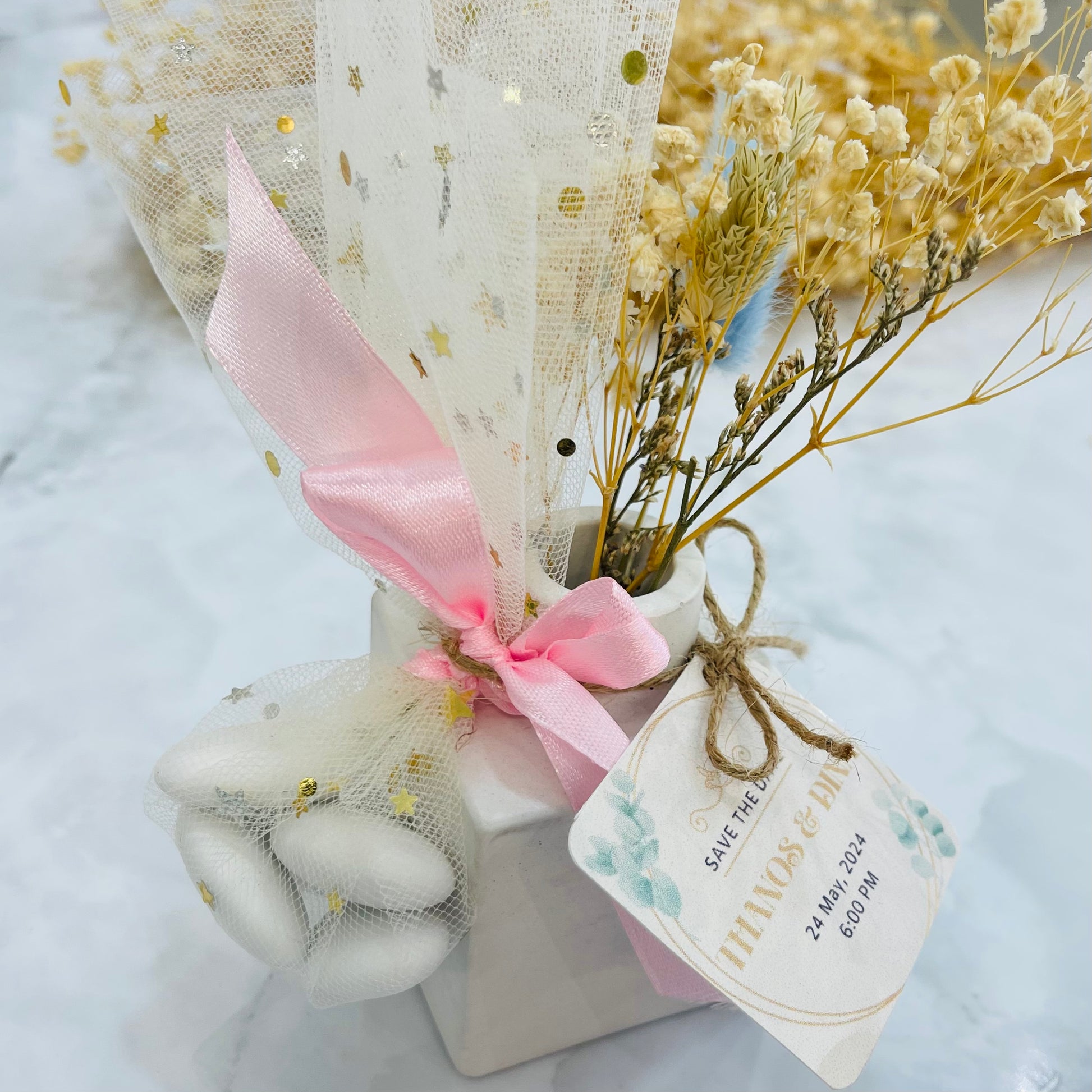 The price includes 5 sugared almonds in a flavor of your choice, a dried flower, and a personalized tag.