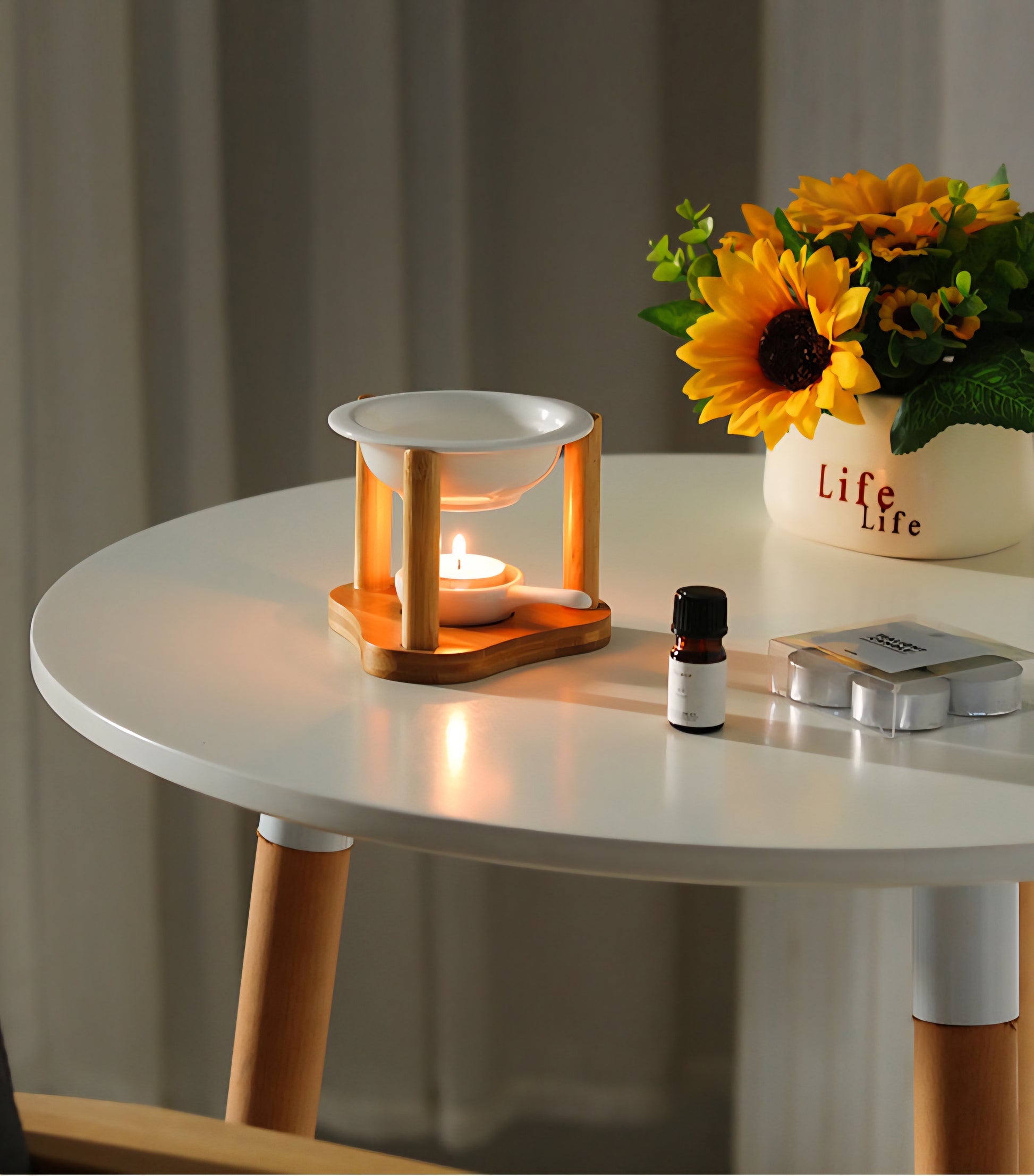 Απλώς τοποθετήστε το αγαπημένο σας κερί σόγιας ή αιθέριο έλαιο στο επάνω κεραμικό μπολ και ανάψτε ένα ρεσώ στη βάση. Η απαλή θερμότητα θα απελευθερώσει το άρωμα, γεμίζοντας τον χώρο σας με μια χαλαρωτική και ευχάριστη ατμόσφαιρα.